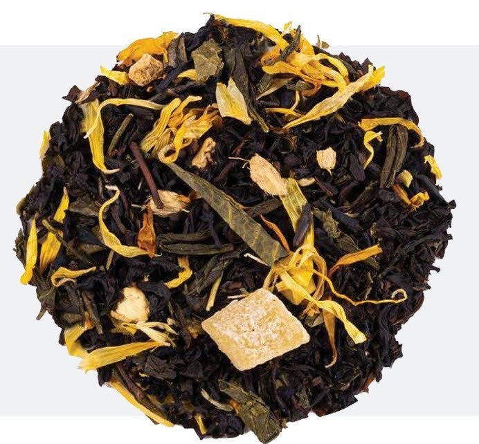 - Ingrédients : Thé noir (Ceylan, Inde du Sud, Chine), morceaux d'ananas, morceaux de mangue, morceaux de papaye, morceaux de gingembre, fleurs de souci.